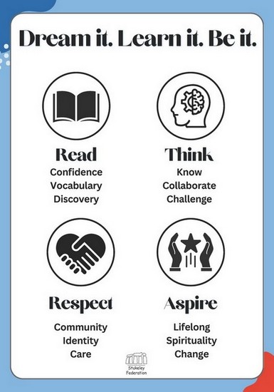 We help the children to develop their understanding and 'live out' our school vision by sharing it with them via our 'Dream it. Learn it. Be it.' representation of our vision.